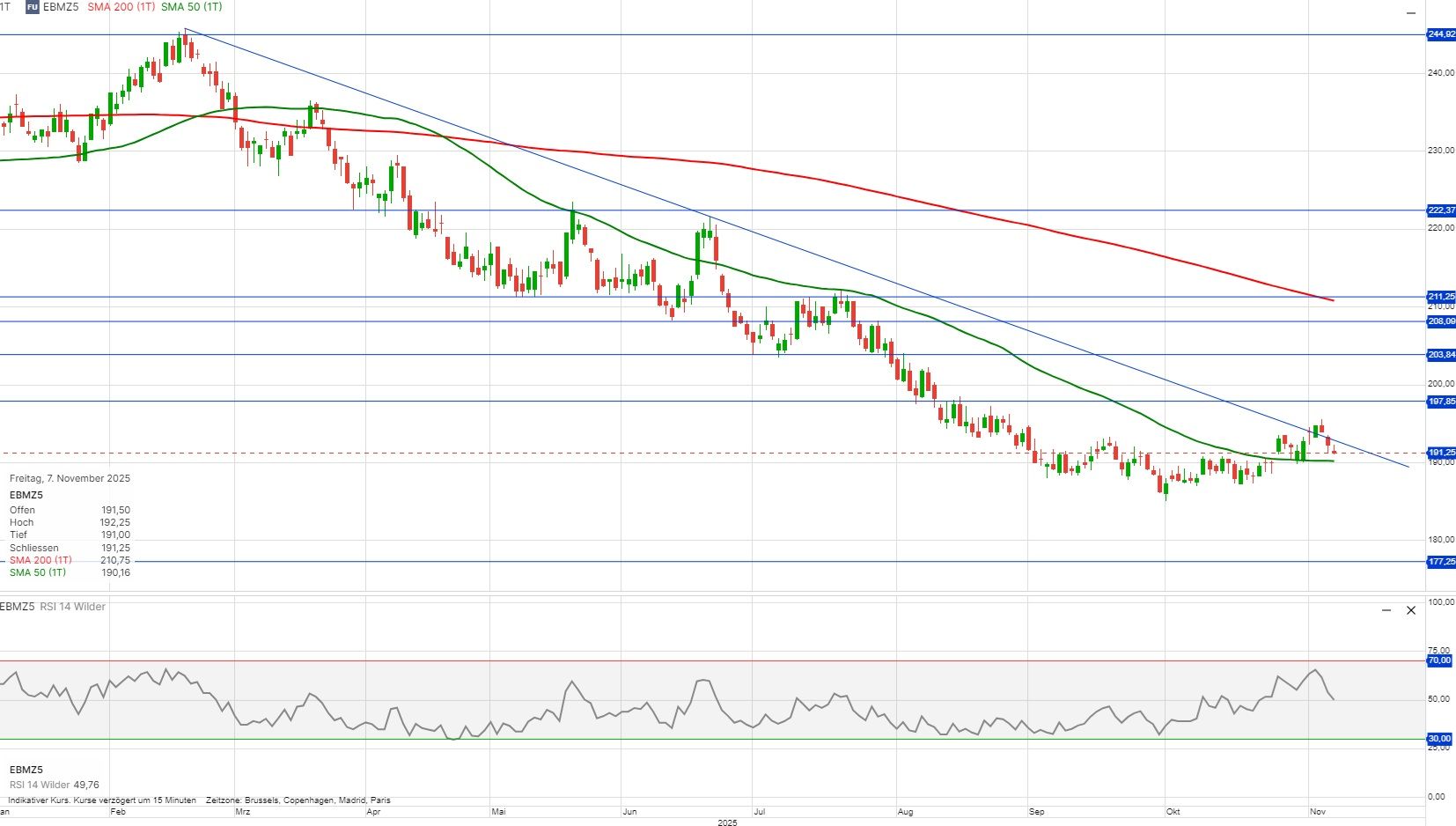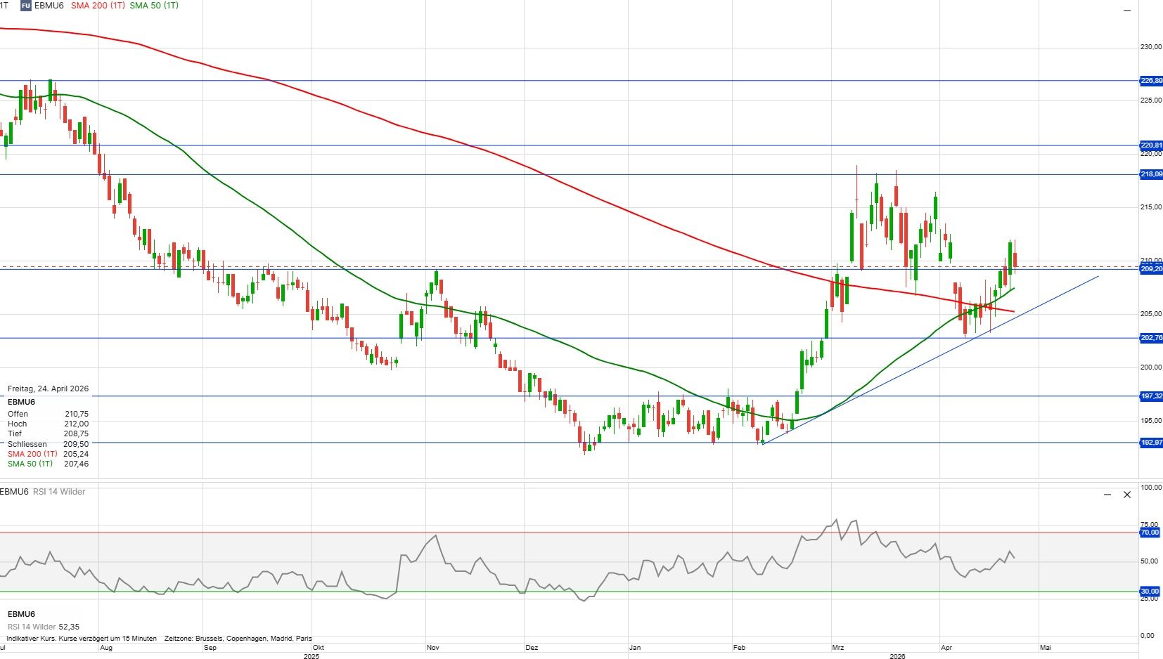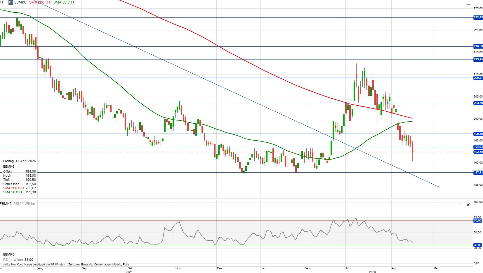Alle Daten der Euronext sind 15. Min verzögert und kostenlos abrufbar. 15 Min. verzögerte Daten der CBoT können nur im Abonnement Getreide & Ölsaaten abgerufen werden. Zugriff auf 15. Min verzögerte Daten der EEX erhalten Kunden im Abonnement Kartoffeln oder Milch.